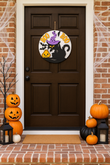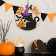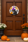 This layered wooden door sign features a mischievous black cat in a purple witch’s hat, surrounded by flying bats, a grinning jack-o’-lantern, and bold “BOO” lettering in bright orange. Perfect for adding a pop of Halloween fun to your front door, porch, or indoor décor, this sign is lightweight, durable, and full of seasonal charm.
