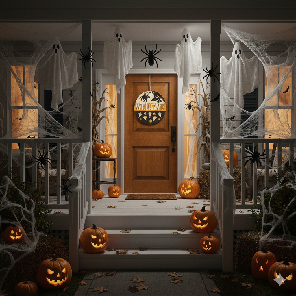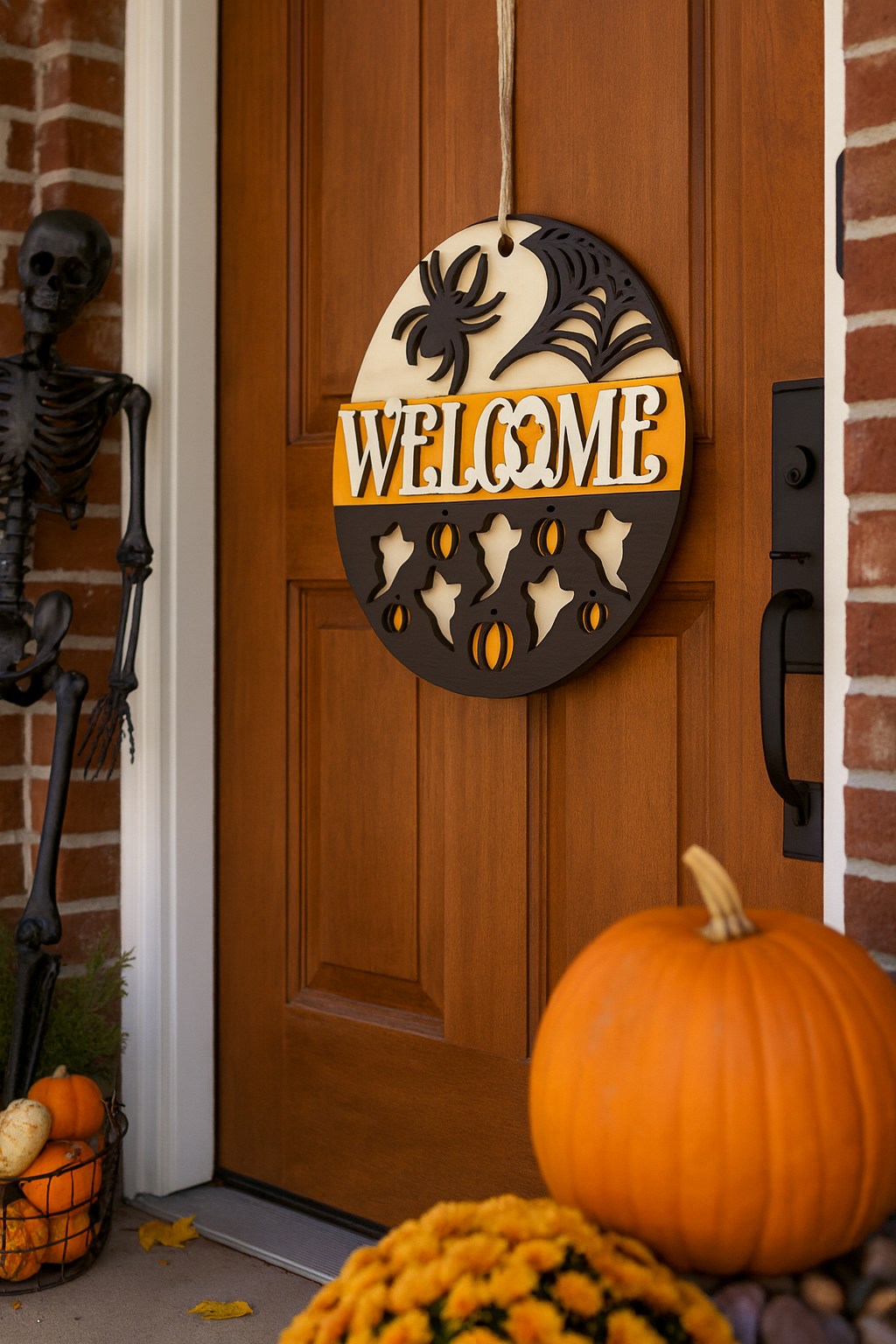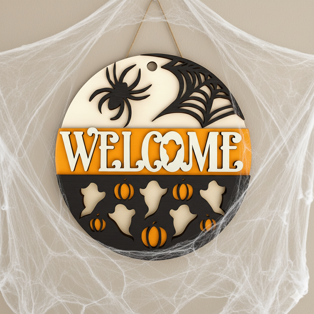 ๐ Halloween Welcome Sign โ Spider, Web, Ghosts & Pumpkins